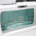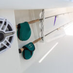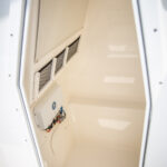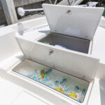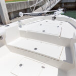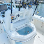 The cockpit is deep to provide a secure feeling while flying kites, working a trolling spread or bottom fishing. There’s a 22-gallon live well in the transom, forward of which is an L-shaped hatch for access to pumps, through-hull fittings and valves. A pair of in-deck macerated fishboxes complete the cockpit.