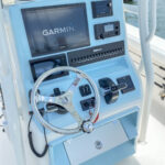 The console, with a T-top, is large enough for a 16-inch Garmin display, a Yamaha Command Link gauges, a VHF radio, and stereo and autopilot controls. One of the two molded footrests opens into a stowage compartment with charging ports inside.