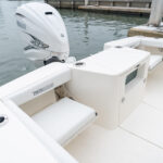 Rod stowage includes under-gunwale racks for up to 9-foot fly rods, and there’s an in-deck cast net locker forward of the console. Other features include pop-up cleats, dual aft jump seats and a fiberglass cooler with a cushion and backrest on the forward end of the console.