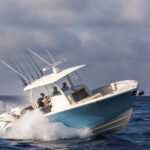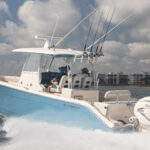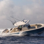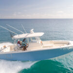 The 350 CC rides a twin-step, deep-vee hull that will run offshore with the herd. Powered by triple Yamaha F300s, the boat has a top end of 54 knots fully loaded (11,500 pounds), according to Cobia. But speed is only part of the equation. Cobia says that at 3,500 rpm, the boat cruises at 29 knots while burning 22.9 gph — not bad for a triple-engine 35-footer. Twin Yamaha XF425 outboards are an option.