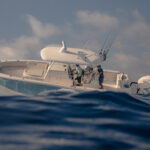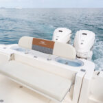 Outfitted with outriggers and a center rigger, the 350 CC trolls like a bigger boat and flies kites easily. The cockpit has a dive door on the starboard side and an access door to the transom. The stern seat lifts to create wide-open access to the bilge to access pumps, fuel filters and raw-water pickups. The battery bank resides in a watertight compartment beneath the helm seats.