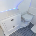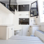 The 350 CC carries its 11-foot, 2-inch beam well forward, providing plenty of fishing room and space for an oversized console, a walk-in head, a spacious berth and an interior that includes faux wood cabinetry, a sink, a shower, and stowage for rods and gear. The battery switches, breaker panel and helm electrics are accessible from inside the console.