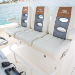 The bow area includes seating molded into the front of the console, with a pair of insulated coolers beneath it, and forward-facing lounges with foldaway backrests that integrate into a U-shaped lounge with stowage. An electrically actuated table stows in the deck and can be partially raised to form a casting platform, or turned into a sunpad with a snap-in cushion. There is additional seating in the cockpit, including a flip-down transom bench.