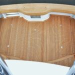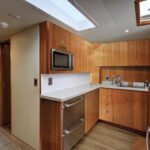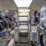 A section of the mezzanine lounge lifts to access the engine room. The remainder of the lounge contains another insulated stowage compartment that can be fitted with a Dometic Eskimo Ice icemaker.