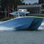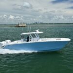 The 37 has a 12-foot beam that carries well forward. The rectangular single-level deck area provides considerable space for fishing and a full complement of angling amenities. The center console has triple helm seats and a rocket launcher that incorporates a rigging station and a roll-out cooler. It weighs in at 14,000 pounds and is powered by four Mercury 350 Verado outboards. With half of the 550-gallon fuel supply and five crew on board, the boat has a 74 mph top end at 6,500 rpm and a 0 to 30 time of just 7 seconds. And while the speed is impressive, the boat’s pinpoint handling characteristics and dry ride are even more so.