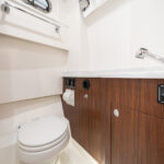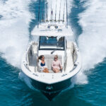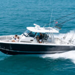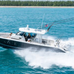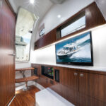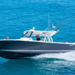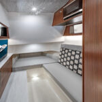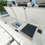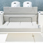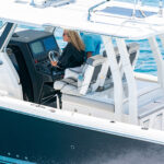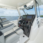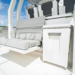 The second social zone is in the cockpit and features a fold-down, 60/40-split mezzanine lounge and a forward-facing transom seat that folds out of the way when fishing or diving. Abaft the helm seats is an entertainment center that includes a sink, fridge, freezer and grill. A starboard dive door makes landing large catches, or getting swimmers back on board, easier.