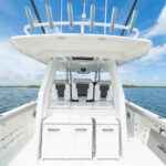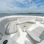 The boat has an overall length of 37 feet, 4 inches, including the extended engine platform, which makes stepping aboard easier while also providing access around the twin 425-hp Yamaha XTO outboards. The 11-foot, 4-inch beam carries well forward, which expands deck space and gives the S 358 a big-boat feel.