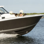 A fiberglass hardtop with a three-sided, tempered-glass windshield covers the helm area, providing shelter for the triple seats and an ergonomically designed dash that puts the electronics and control switches within easy reach. Access to the cabin is through a door on the port side of the console. The air-conditioned area includes an enclosed wet head, wooden cabinetry, a galley, a V-berth, a settee and a flat-screen television. Two skylights and opening portholes provide natural light and ventilation. Pursuit says the cabin is the largest of any boat in its class.