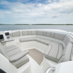 With the DNA of a serious fishboat, the S 358 has lots of rod stowage, a rigging station, twin 27-gallon fishboxes and a 32-gallon live well. However, there also are two areas that Pursuit calls “social zones.” A nicely appointed bow area has wraparound seating with electrically actuated backrests and a lounge on the forward part of the console. A table retracts into the deck with the push of a button. The bow area can be sheltered by a canvas shade with drop-in support poles.