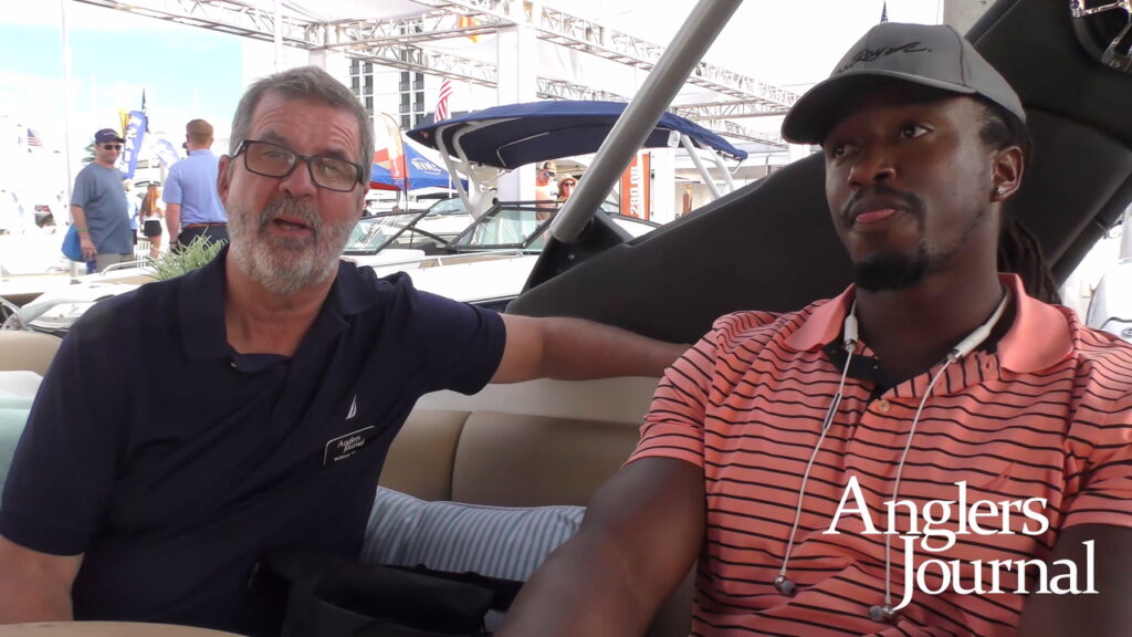Anglers Journal Editor-in-Chief Bill Sisson talks fishing with NFL veteran Willie Young at the Sea Ray display during the 2018 Ft. Lauderdale Boat Show.