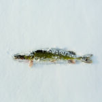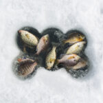 Then a fish appears. One of the baits is taken. The flag trips and bounces. We race over. Out through the ice it comes. And in bare hands you feel the temperature of the water in the fish itself — that you are, in fact, holding the pond in your hand. There is a density to this. The fish feels thicker. Maybe that’s because your hands without gloves have also grown denser, the blood thicker, slower. But there is a warmth in the color of the scales and fins. Winter fish are more like a festival — the color is in direct contrast to the ice you stand on, the monochrome. If we are to take a fish home, we leave it on the ice. My son stands there and studies it. He never does this when we’re fishing from the boat in the ocean. For some reason, the starkness of the fish lying on the ice, preserved as if indefinitely, like a wooly mammoth, gives him pause.