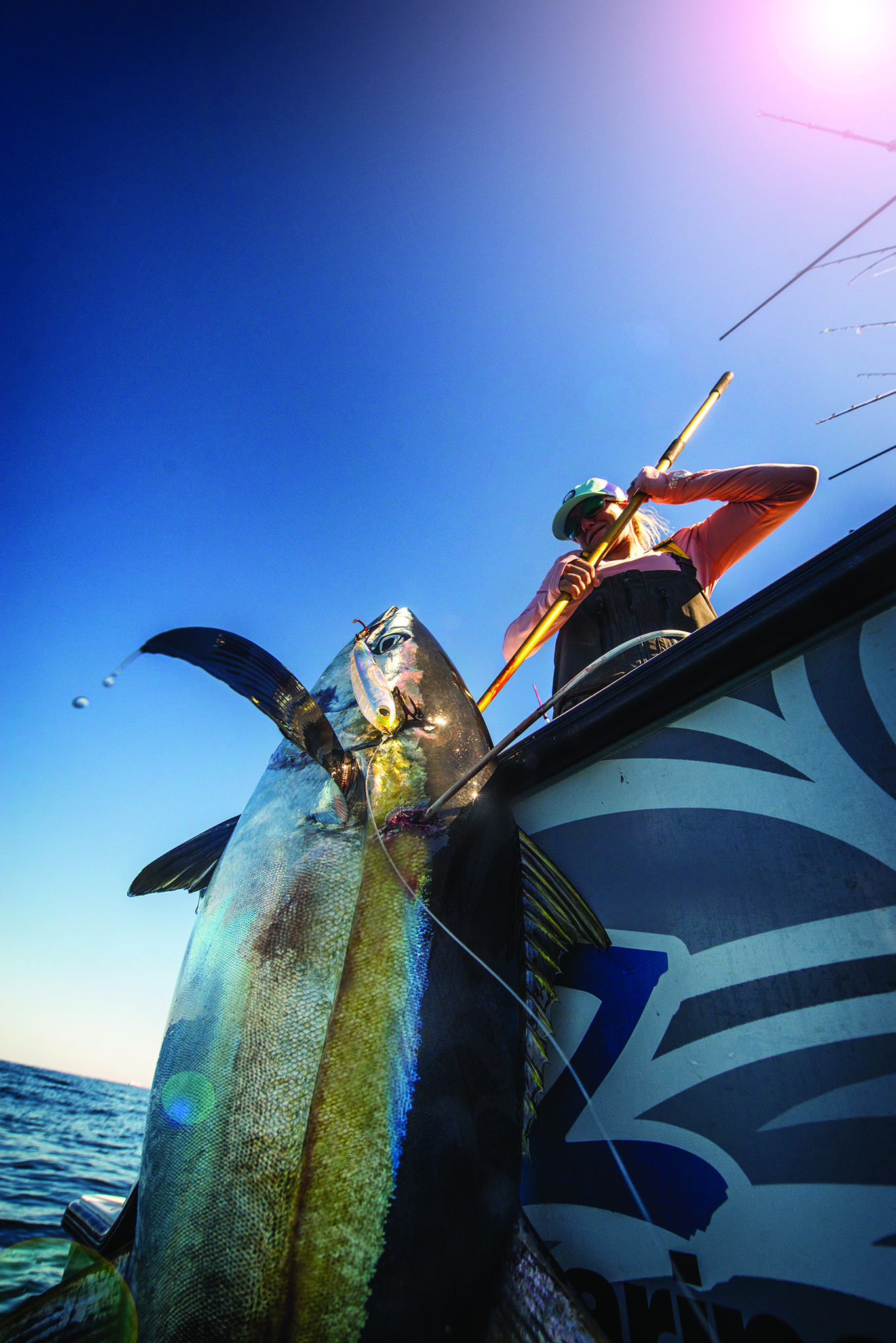 A chunky Gulf of Mexico yellowfin comes aboard. I filmed an episode of Anglers Journal TV with Pique this past spring and enjoyed awesome action around one of the “floater” rigs in 5,400 feet of water. These rigs remain in position thanks to sophisticated dynamic positioning technology, which uses GPS guidance systems tied into powerful underwater thrusters. The fish love it.