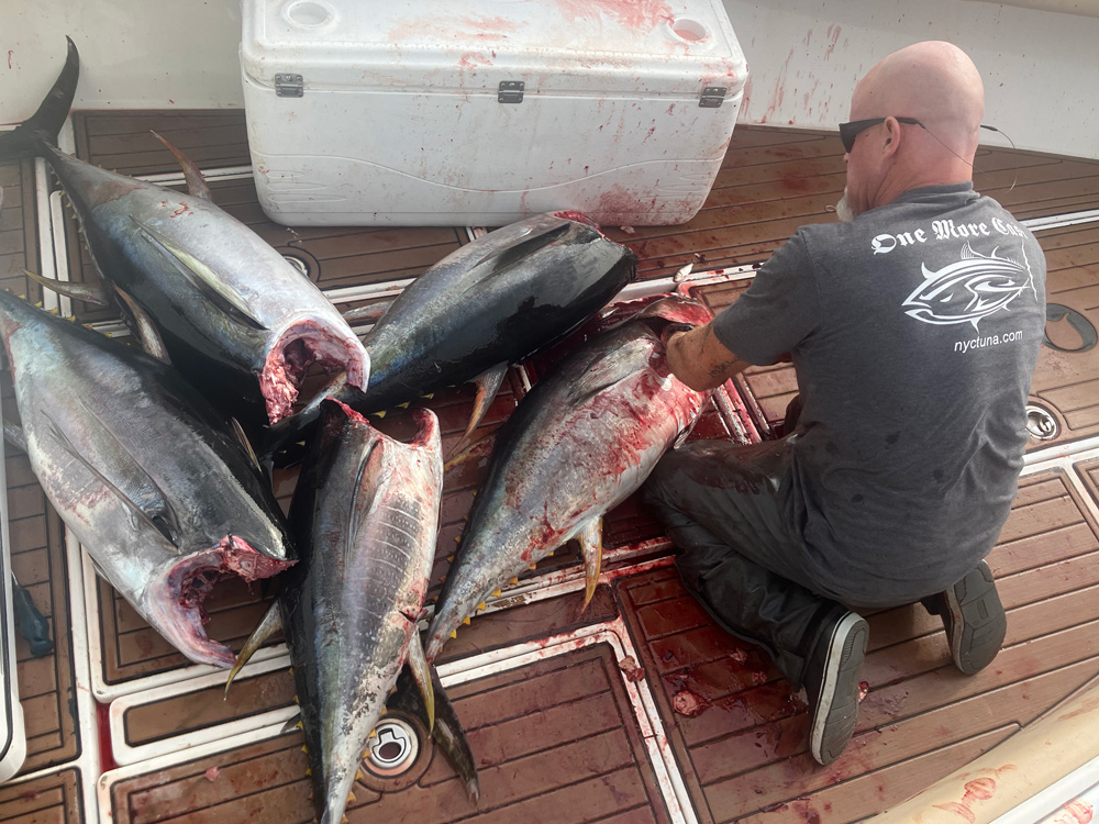 It’s not unusual for me to have three yellowfin on deck thrashing wildly as I bleed-out, core and ice all three at once, their thumping tails throwing blood all over my face and spattering my arms. It’s hard to call yourself a conservationist when you have to scrub behind your ears, lest you show up to dinner with fish blood on the back of your neck.