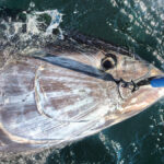 The line on the reel is colored in sequence red, yellow, green and black. When my big fish hit, 300 yards of red disappeared pretty quickly. After that, the tuna ran off 300 yards of yellow and 300 yards of green. When the fish took me into the black, there wasn’t a lot of line left. All the while, the captain had the boat in gear and was steaming up fast on the fish. I reeled the green and yellow back in. Then the fish ran again — out went the yellow and the green once more. Now I had three colors to muscle back in.