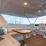 The bridge is accessed via a teak stairway from the cockpit, which houses the 10′ outboard-mounted tender on a custom cradle, with 1,000lb davit for easy launching and retrieval. The bridge helm further improves navigational sightlines from the already well-appointed lower helm and is complimented by twin Stidd captains chairs to your spec, and can be outfitted with your chosen navigational equipment.
