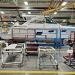 A full-width hardtop with a top-to-bottom windshield and exclusive sliding bow window to port allows for an open, inviting cockpit experience. The fiberglass hardtop with full-width motorized glass sunroof opens to the sky, while interconnected SmartZone™ seating, from the expansive bow to triple helm seating and U-shaped lounge aft, increases choice for all. The cockpit environment is yours to control with available 18,000 BTU reverse cycle air conditioner and standard Rockford Fosgate® stereo with USB port, Bluetooth® and ten JL Audio® blue LED lighted chrome-finished speakers with 600W amplification and lighted 200W subwoofer.